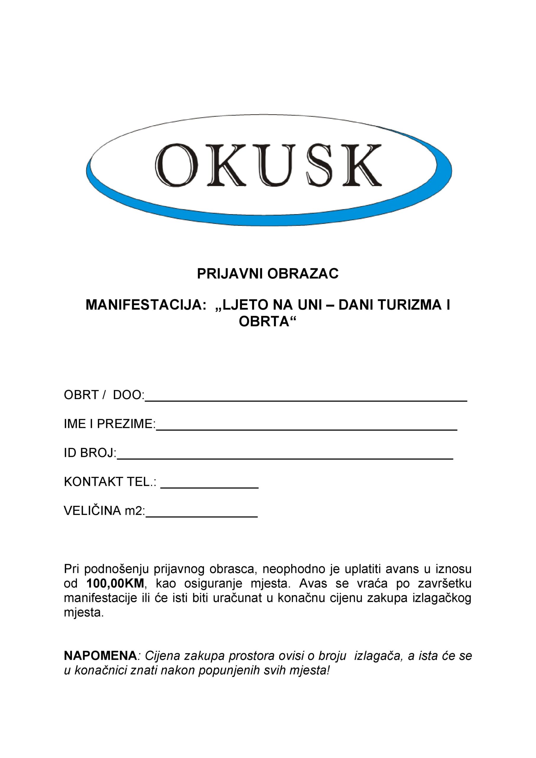 Poštovani izlagači i učesnici Manifestacije: “Ljeto na Uni – dani turizma i obrta”, za Vašu prijavu, neophodno je popuniti obrazac i dostaviti u OKUSK.