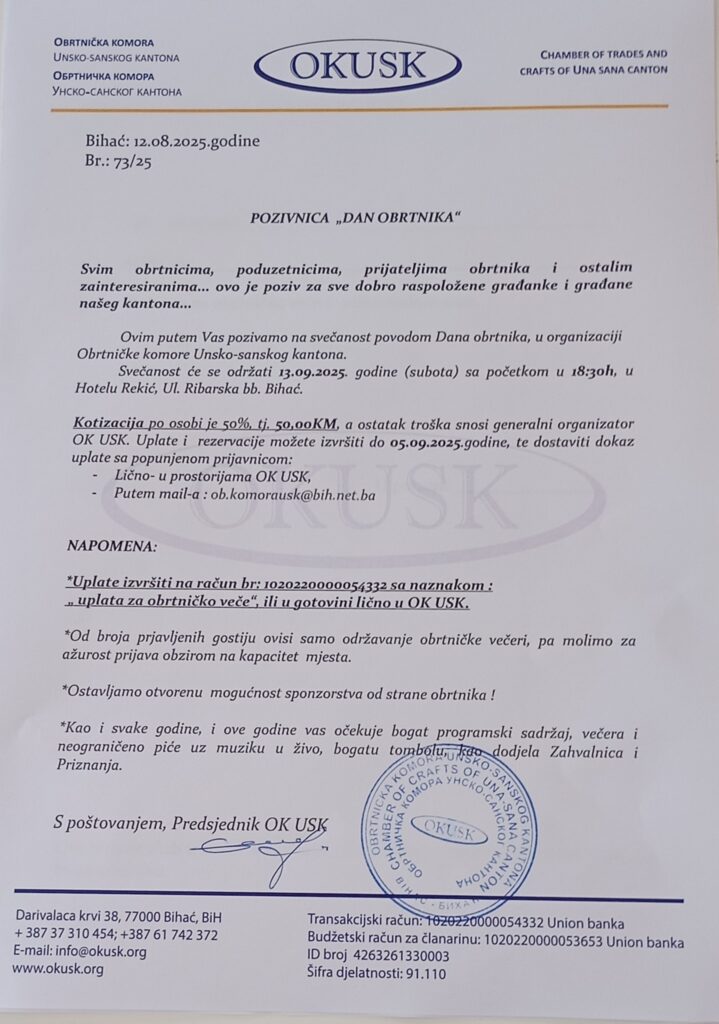 Ovim putem Vas pozivamo na svečanost povodom Dana obrtnika, u organizaciji Obrtničke komore Unsko-sanskog kantona.